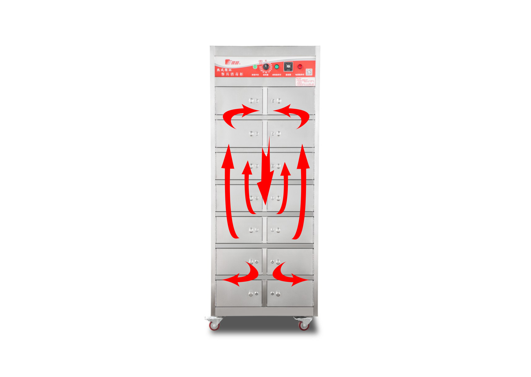 分隔式远红外线热风循环餐具消毒柜具备自动温度控制,准确控制设定温度,配合热风循环,确保箱内部达到同样温度。